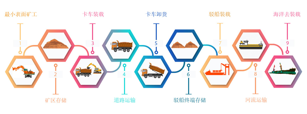 邦阿米项目将生产直接航运矿石("DSO"),该矿石将由通过专用运输公路运输的地表矿工开采,并储存在河港。从那里,矿石将被冲到转运区,转移到远洋船只——海角大小和巴拿马船只。